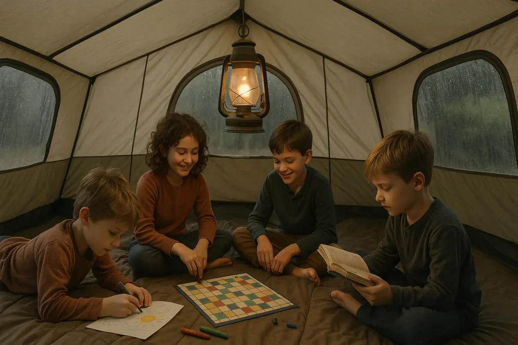 There’s nothing like the sound of rain on the tent roof. Turn it into an adventure by setting up a comfy hangout. Toss extra blankets and pillows in the tent, hang up a couple of LED lanterns, and let the kids spread out books, stuffed animals, or even build a blanket fort inside. Card games (like Uno), dice games, and travel-size board games work wonders when you’re stuck inside. Sometimes all it takes is a deck of cards to kick off hours of family laughs.